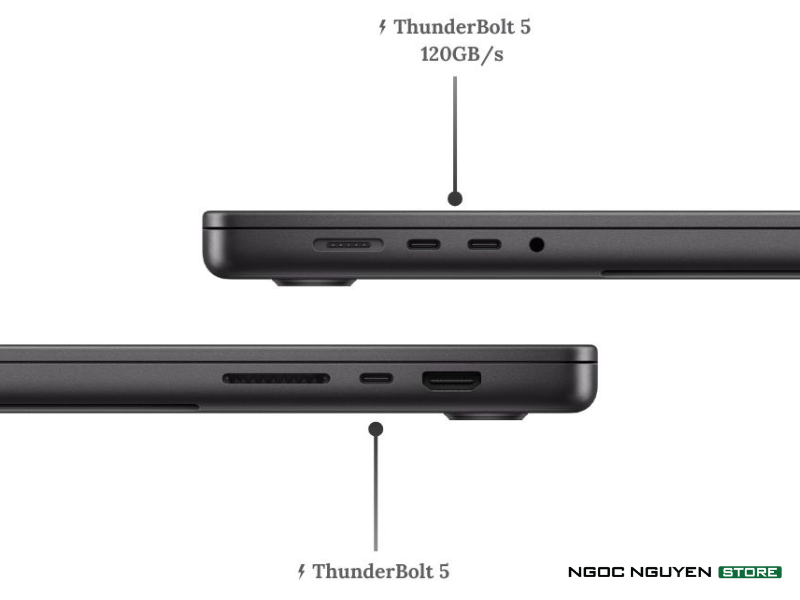 MacBook Pro M4 Max được trang bị ba cổng Thunderbolt 5, cho phép truyền tải dữ liệu nhanh chóng và kết nối linh hoạt với các thiết bị ngoài. Ngoài ra, máy còn có cổng HDMI, khe đọc thẻ SDXC, jack tai nghe 3.5mm và sạc MagSafe 3.