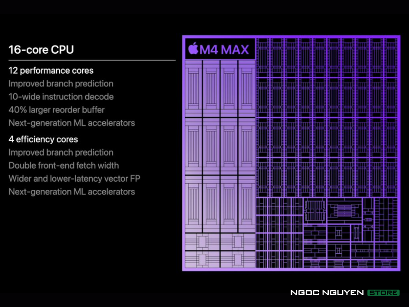 Chip M4 Max được xây dựng trên kiến trúc hợp nhất thế hệ 3nm, tích hợp CPU, GPU, và Neural Engine. Điều này cho phép người dùng đa nhiệm một cách liền mạch, nâng cao hiệu suất làm việc, đặc biệt hữu ích cho các nhà sáng tạo và người dùng chuyên nghiệ