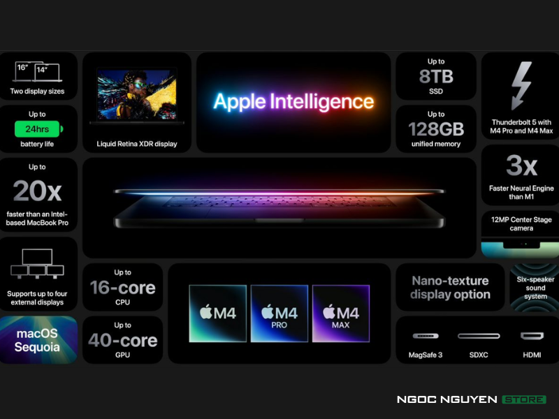 Apple Intelligence trên MacBook Pro M4 Max mang lại những tính năng AI tiên tiến, tự động hóa các tác vụ như sắp xếp tài liệu, tìm kiếm nội dung và phân tích dữ liệu. Công nghệ này sử dụng khả năng học máy của chip M4 Max, giúp người dùng làm việc hiệu quả hơn, tiết kiệm thời gian và tối ưu hóa trải nghiệm làm việc.