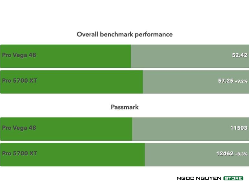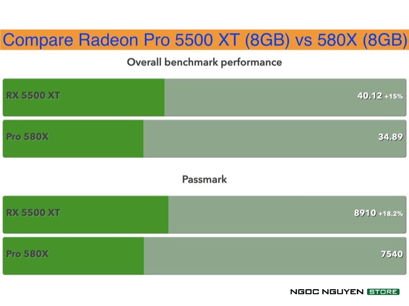 Chiếc GPU Radeon Pro 5500 XT cho hiệu năng cao hơn một 15% so với GPU RP 580X (8GB GDDR6) và thấp hơn gần 30% so với chiếc GPU RP Vega 48 (8GB HBM2) trên iMac 5K 2019.