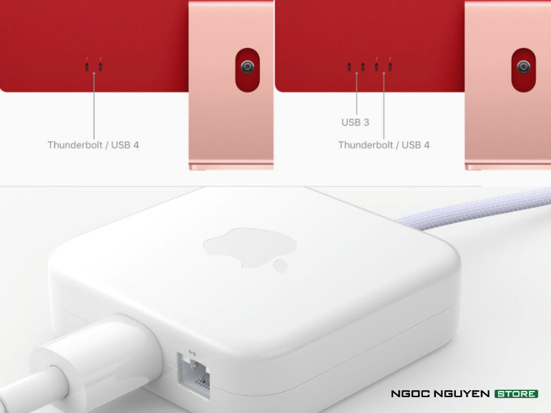 Các cổng đi kèm với iMac 24 inch sẽ tuỳ thuộc vào Option mà khách hàng chọn. Cả hai mẫu đều có hai cổng USB 4/Thunderbolt 3 nhưng bản Option 8-Core GPU sẽ có thêm hai cổng USB 3 và phiên bản iMac 24 inch 256GB sẽ có 4 cổng.