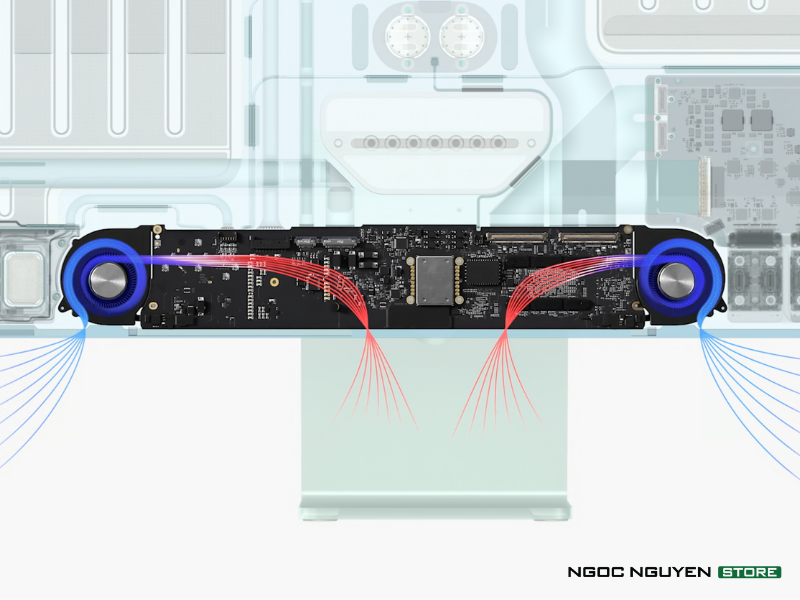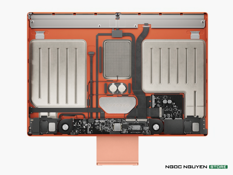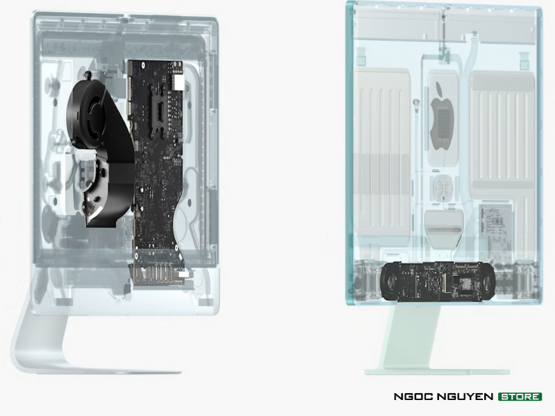 Đó chính là sự khác biệt của M1 đem lại. Nếu như các mẫu iMac dùng Intel đời trước Apple thường sử dụng các bo mạch lớn để có chỗ cho Vi xử lý, SSD, HDD, RAM, Quạt tản nhiệt,… thì giờ đây tất cả gói gọn trong con chip SoC tiến trình 5nm để bạn có một chiếc máy AIO chỉ mỏng 11.5mm.