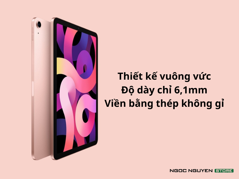 Apple iPad Air 10.9 2020 được thiết kế vuông vức giống như thiết kế của iPad Pro trong những năm qua. Viền màn hình của máy có thiết kế 4 cạnh đều nhau, và có cực mỏng với độ dày chỉ 6,1mm.
