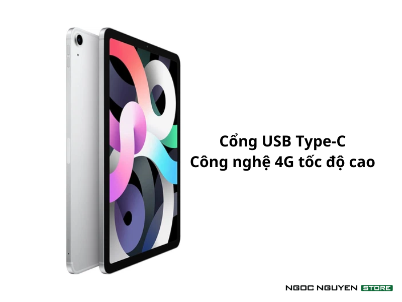 IPad Air 2020 còn sử dụng cổng USB Type-C, hỗ trợ sạc 20W và truyền dữ liệu tốc độ cao 5Gbps. Bên cạnh đó, công nghệ Wi-Fi 6 cũng được tích hợp trên máy và có cả tùy chọn LTE. Khả năng kết nối LTE trên iPad Air mới nhanh hơn 60% so với phiên bản trước đó.