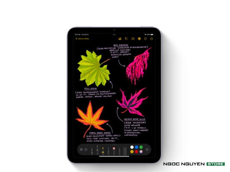 Màn hình Liquid Retina 8.3 inch trên iPad mini 2021 5G hiển thị nội dung sắc nét, sống động và chân thực. Công nghệ màu sắc thích ứng True Tone, dải màu rộng P3 giúp văn bản chi tiết, màu sắc chính xác dù bạn đang ở trong bất cứ môi trường nào. Độ sáng tối đa của màn hình iPad mini 2021 5G lên tới 500 nits, hiển thị rõ ngay cả khi sử dụng dưới trời nắng. Kích thước màn hình 8.3 inch cũng là lớn hơn các thế hệ iPad mini trước đây, cho bạn tận hưởng nhiều nội dung hơn trên một chiếc iPad nhỏ gọn.