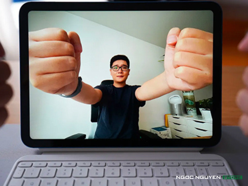 iPad Gen 10 là chiếc iPad đầu tiên được trang bị camera đặt ngang, cảm biến 12MP, khẩu độ f/2.4, hỗ trợ góc chụp rộng đến 122 độ và tích hợp chế độ Center Stage. Cho dù người dùng đang thực hiện cuộc gọi FaceTime hay quay video cho phương tiện truyền thông xã hội, họ sẽ luôn nhìn thẳng về phía máy ảnh. Từ đó camera có trường nhìn 122 độ hỗ trợ Center Stage sẽ tự động xoay và thu phóng để theo dõi người dùng khi họ di chuyển xung quanh.