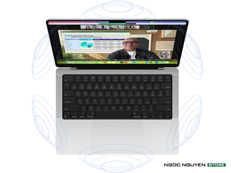Hệ thống âm thanh tiên tiến sử dụng 6 loa tích hợp và công nghệ âm vòm 3D như Spatial Audio và Dolby Atmos để mang đến âm thanh sắc nét, mạnh mẽ, tạo cảm giác như bạn đang đắm chìm trong trải nghiệm âm nhạc và phim ảnh từ mọi hướng của căn phòng mà không cần loa ngoài.