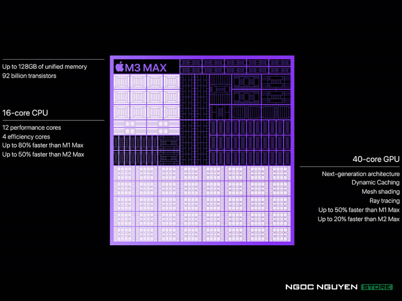 Con chip M3 Max tối tân được Apple nhận định như là một bước tiến lớn về công nghệ sản xuất vi mạch máy tính, chip sở hữu 14 nhân CPU được thiết kế dựa trên tiến trình 3 nm hoàn toàn mới, mỏng nhẹ hơn những thế hệ tiền nhiệm nhưng đồng thời lại cho tốc độ vận hành và hiệu suất còn vượt qua được giới hạn điện toán với khả năng thực hiện lên đến 18 nghìn tỷ phép tính mỗi giây.