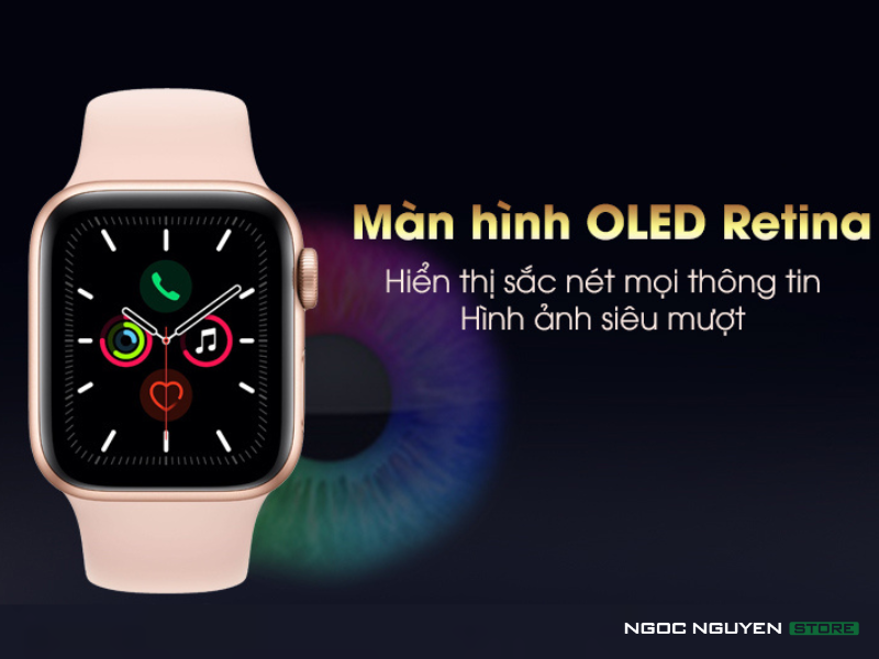 Màn hình trên Apple Watch S5 44mm sử dụng tấm nền OLED cao cấp, tiết kiệm pin hơn, độ sắc nét đạt chuẩn Retina - nghĩa là bạn rất khó để nhận biết các điểm ảnh, rỗ hạt bằng mắt thường.
