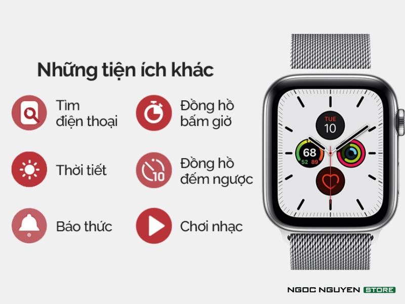 Ngoài những tính năng kể trên, Apple Watch Series 5 còn có nhiều tính năng khác như la bàn, đếm số bước chân, dự báo thời tiết, nghe nhạc với tai nghe Bluetooth, đồng hồ bấm giờ, định vị, đồng hồ đếm ngược,...