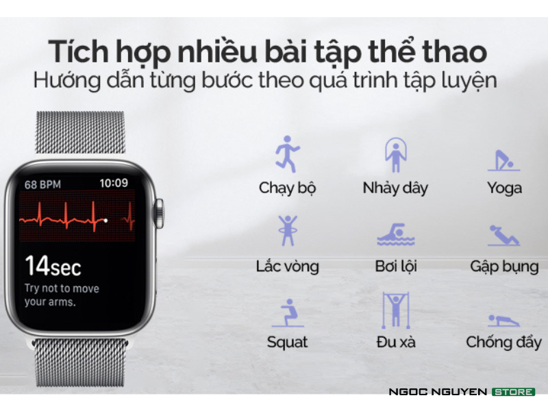 Đồng hồ thông minh được tích hợp nhiều bài luyện tập thể thao như chạy bộ, đạp xe, bơi lội, đi bộ, yoga,... giúp bạn có những bài tập khoa học để nâng cao sức khỏe.