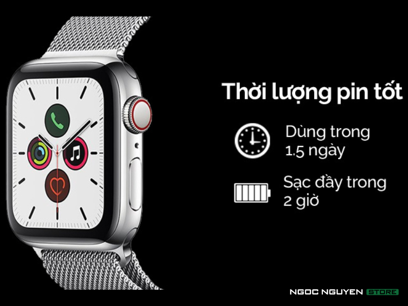 Với thời lượng pin lên đến 1.5 ngày cùng thời gian sạc chỉ 2 giờ, người dùng có thể yên tâm làm việc suốt ngày dài mà không lo hết pin giữa chừng trong quá trình sử dụng. Điểm nổi bật ở mẫu đồng hồ này là có bộ nhớ trong 32 GB và 1 kho ứng dụng riêng tuyệt vời, bạn yên tâm lưu trữ mà không lo hết dung lượng.